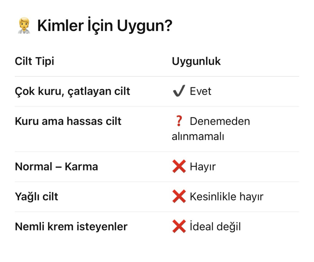 Her kuru cilde uygun değil, günlük gece kremi gibi düşünülmemeli.