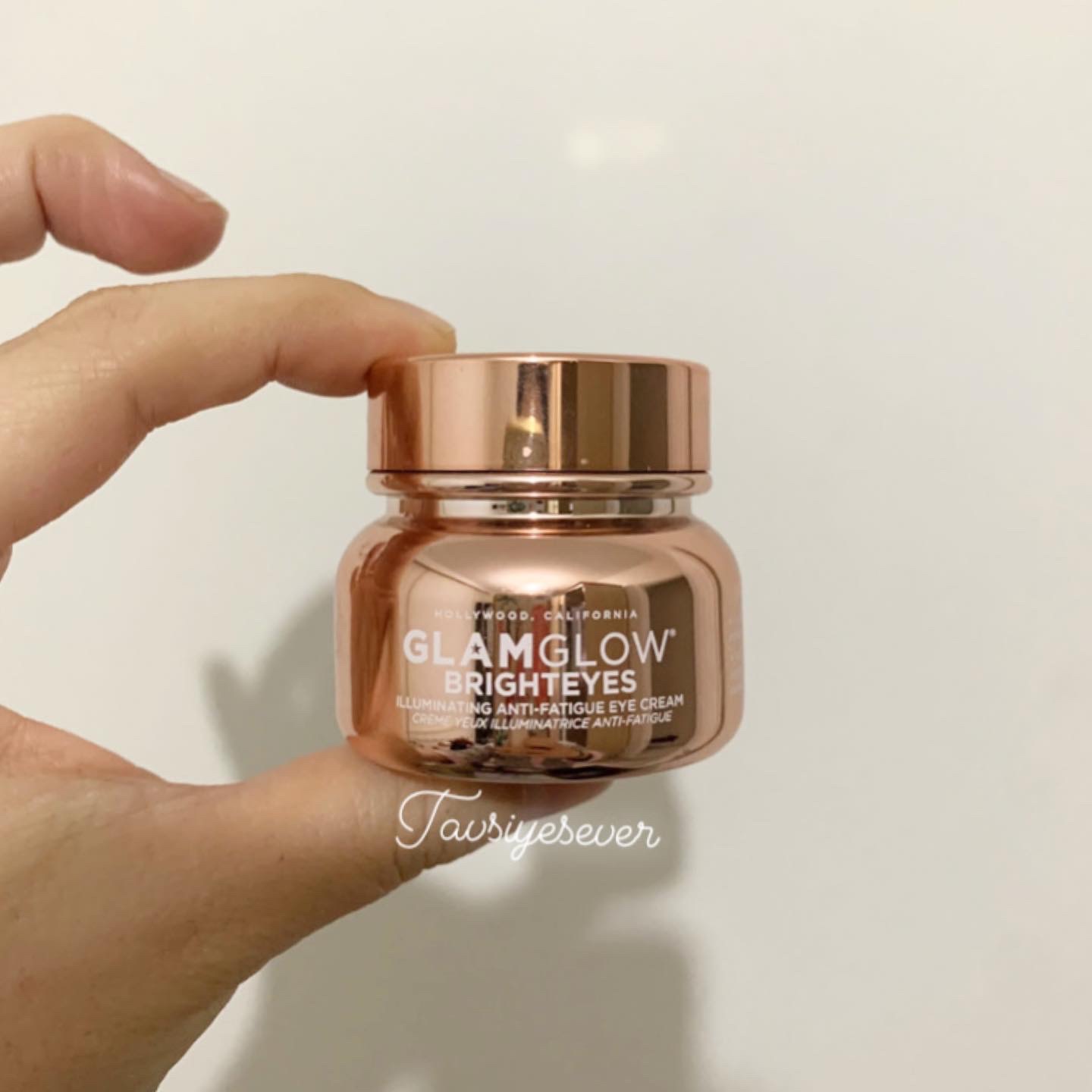 Glamglow brighteyes illuminating anti fatigue göz kremi, ben bu yazıyı yazarken 549 Tl ye satılıyor. 15 ml göz kremi için oldukça pahalı. O zaman bakalım vaatleri neymiş. İçeriğindeki peptitler, kafein ve yoğun miktarda bulunan hiyalüronik asit ile göz çevresindeki koyu halkaları anında aydınlatarak yorgun görünümün azalmasına yardımcı olur. Anında dinlenmiş ve ışıl ışıl bir görünüm sunar. Cilt tarafından hızlıca emilerek hassas göz çevresi bölgesini güçlendirmeye destek olur. Yalnızca 4 haftada cildin nem bariyerini güçlendirerek ince çizgi, kırışıklık ve yorgunluk izlerinin silinmesini sağlar. İçeriğinde bulunan mikro inci ışıltıları göz çevresinin daha aydınlık görünmesine yardımcı olur. Göz çevresini makyaja hazırlar.